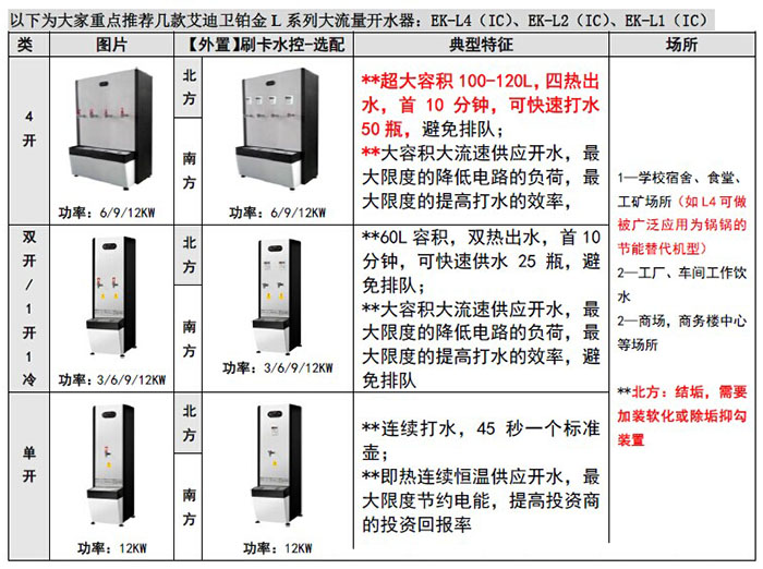----iDIY步進式:節能EK-L2EK-L4系列,大容積大流速供應開水,最大限度的降低電路的負荷,最大限度的提高打水的效率,避免排隊;經典產品:EK-B60IC EK-B120L4IC(可附上重點產品特征)
