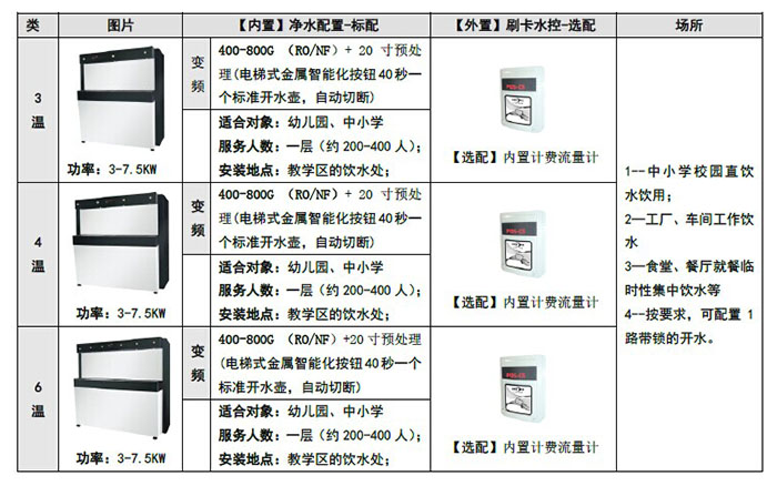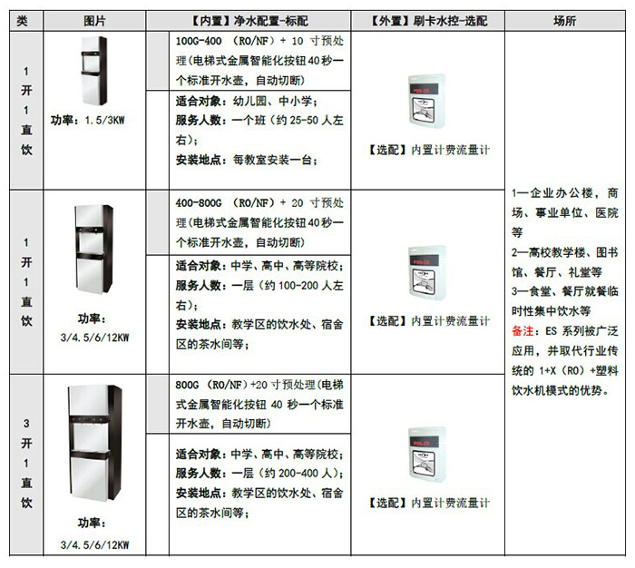----》典型機型:ER-42、ET-43、EW-44、EW-46,可滿足中小學課間操集中供應大流量的溫度適宜的直飲水,符合政府校園直飲水項目的各技術指標